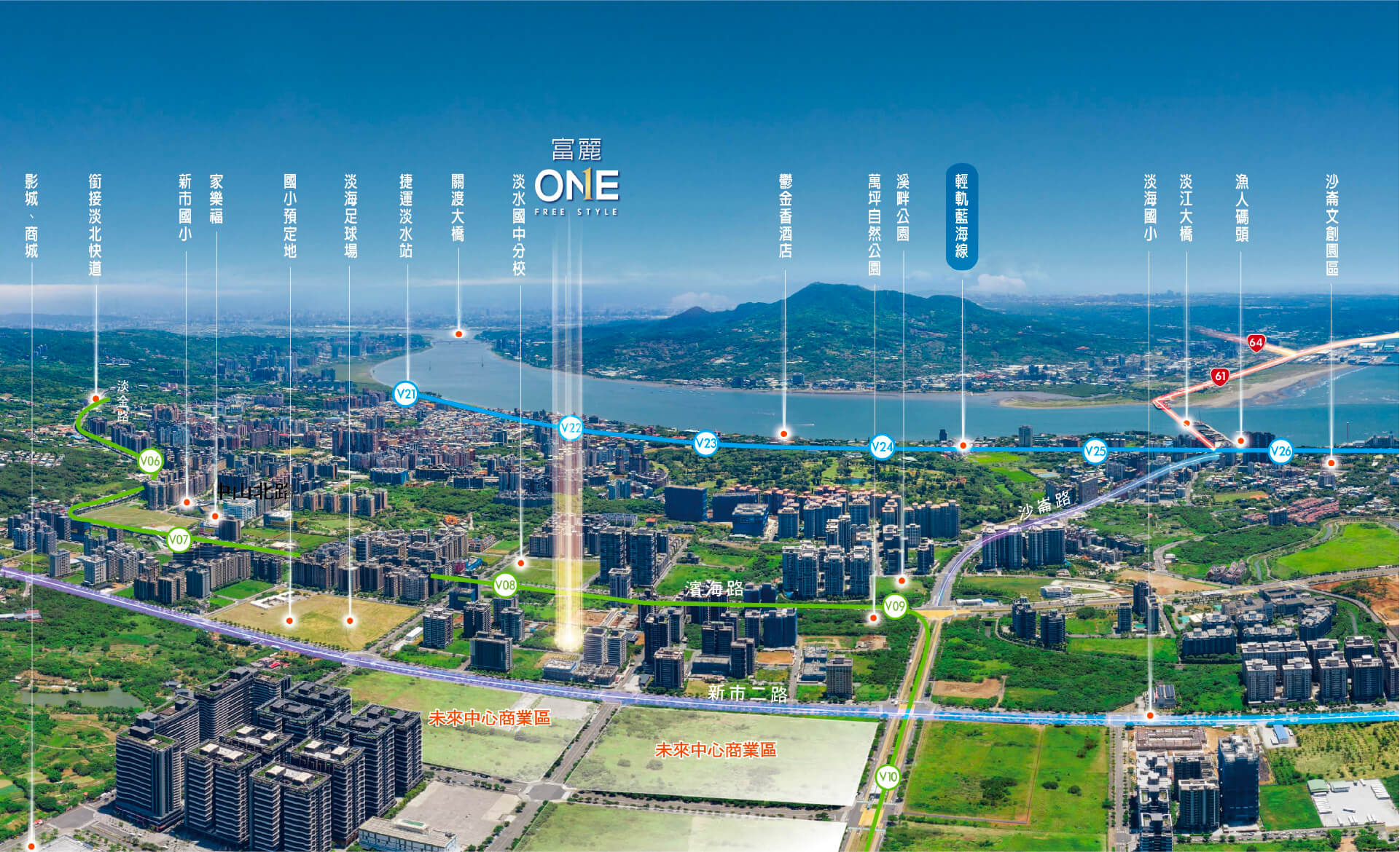 雙北人引頸企盼,2026超級淡海!淡海大橋、淡北快道、輕軌二期即將完工通車。「富麗ONE」位居新市鎮城心,車行約8分鐘直上淡海大橋,經淡金公路接淡北快道、約30分鐘抵北士科。迎接淡海房價大躍進,贏家爭一席。