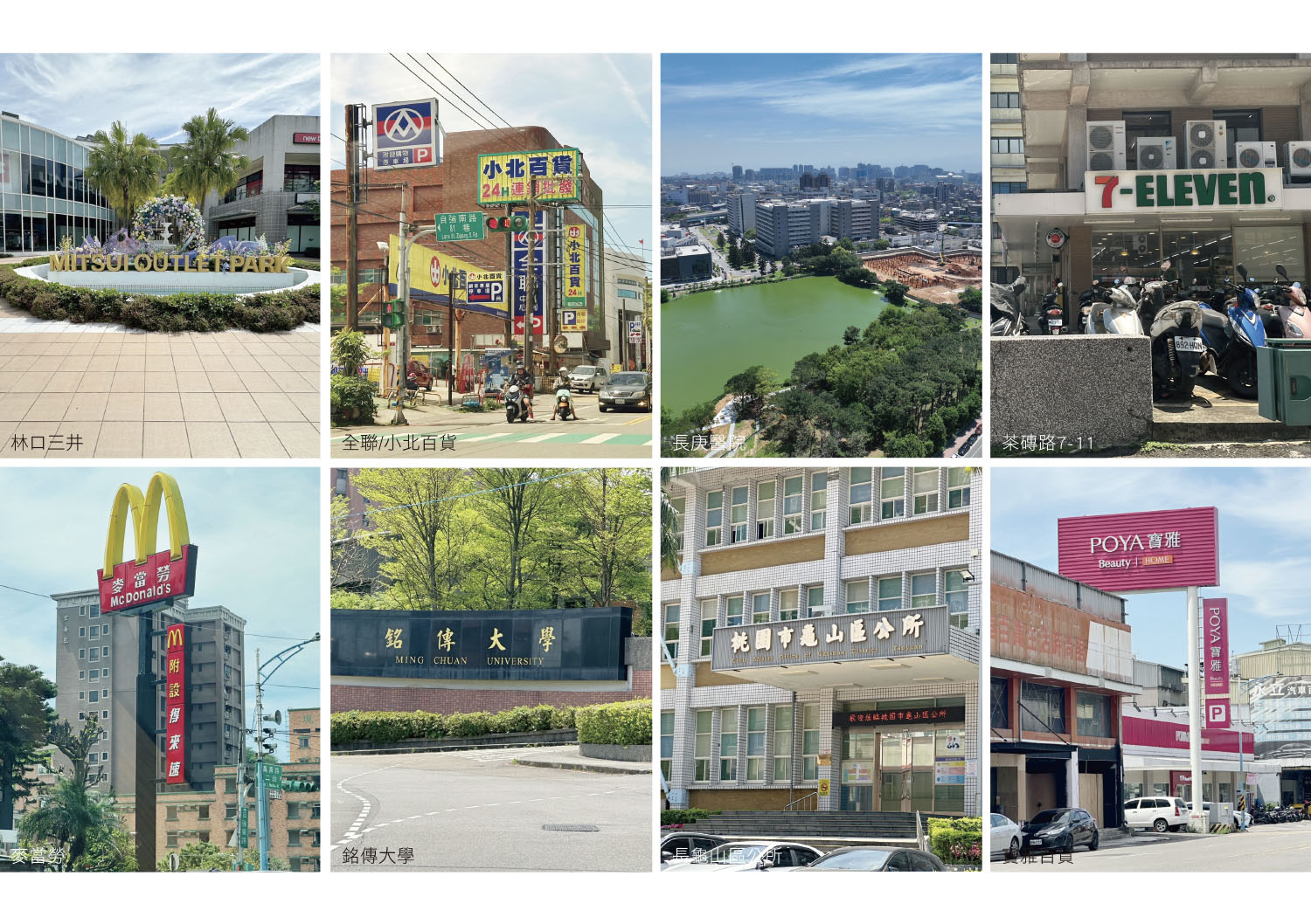 此區域生活機能豐富且便利,周邊有龜山后街市場、全聯福利中心、小北百貨、龜山區公所等,滿足居民日常採購與行政需求。此外,區內有銘傳大學、龍華科技大學等高等學府,周邊商全繁榮;另開車10-15分鐘距離即可達林口三井購物中心,提供多樣化的餐飲、購物選擇;距離10-15分鐘亦可達林口長庚醫院,完善的醫療資源提供就醫的便利性。此區擁有完善的商業設施、醫療資源、教育機構與交通網絡,提供舒適便利的生活環境。