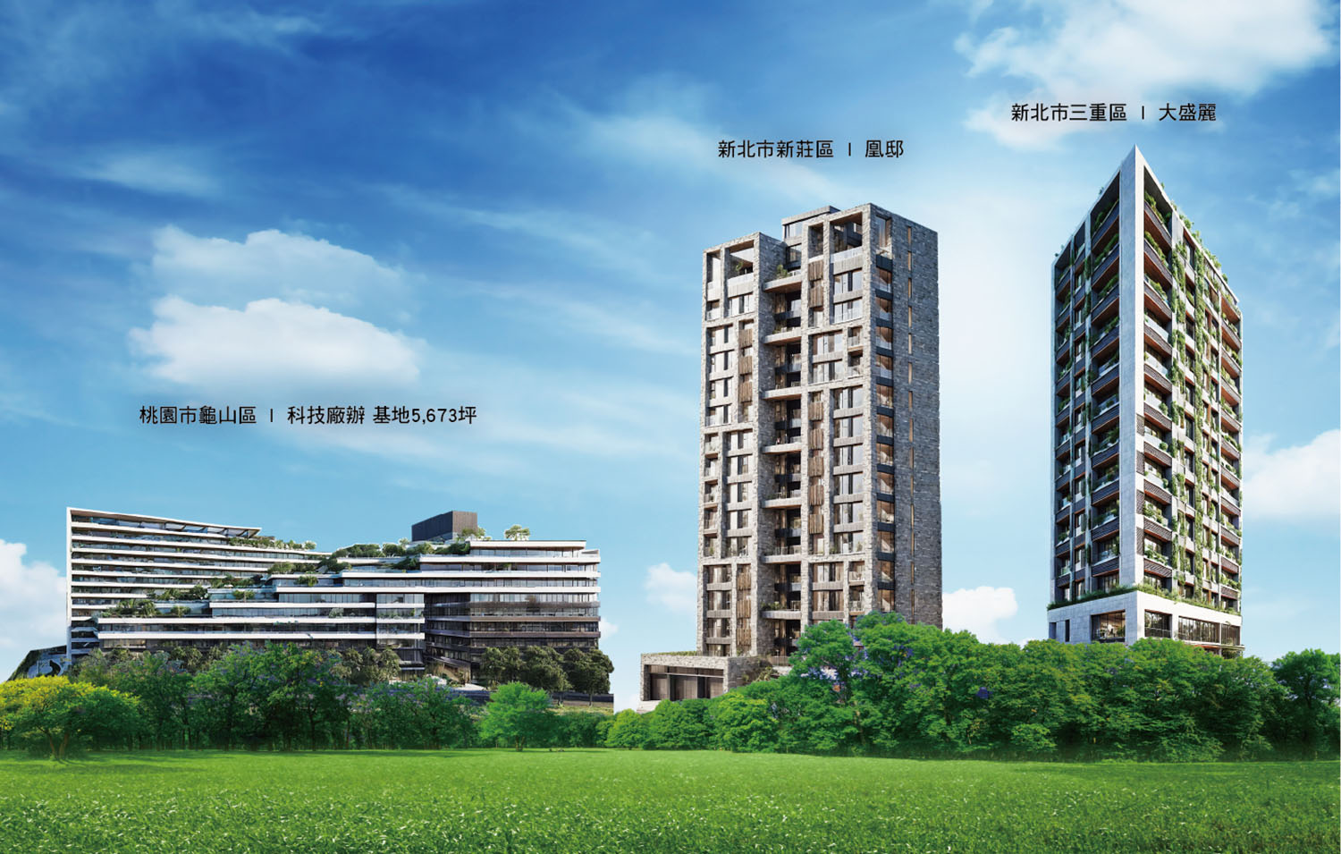 代表性作品包括新北市新莊區的「鳳邸」、新北市三重區的「大盛麗」,以及桃園市龜山區的科技廠辦等等,皆深受業界好評。